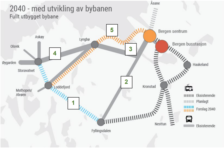 Kommunedelplan for kollektivsystemet mellom Bergen sentrum og Bergen vest anbefaler at det etableres Bybane i korridor 5 over Laksevåg og Dokken (oransje linje) og korridor 1 mellom Fyllingsdalen og Loddefjord (blå linje).
