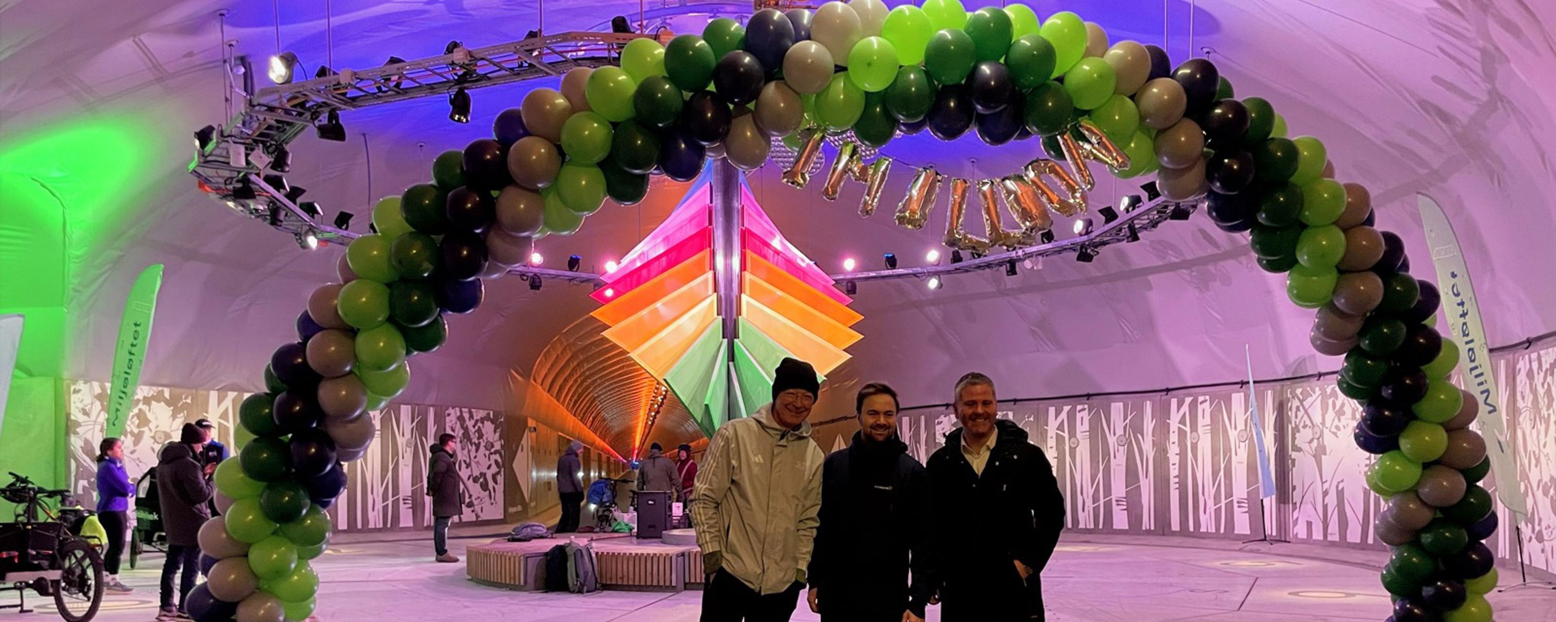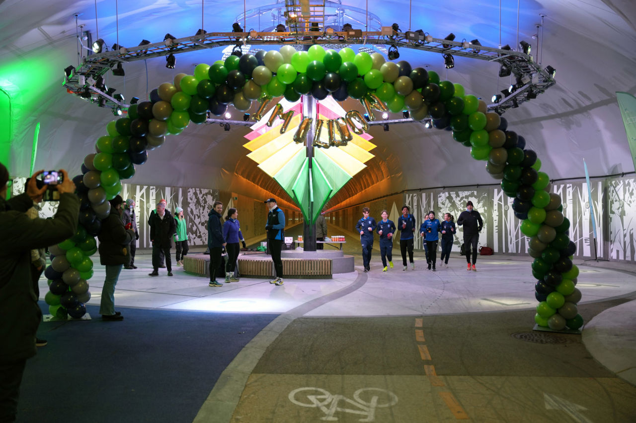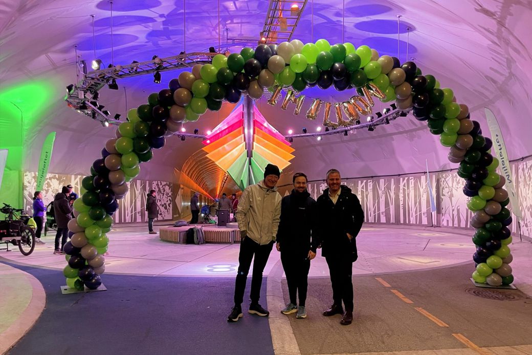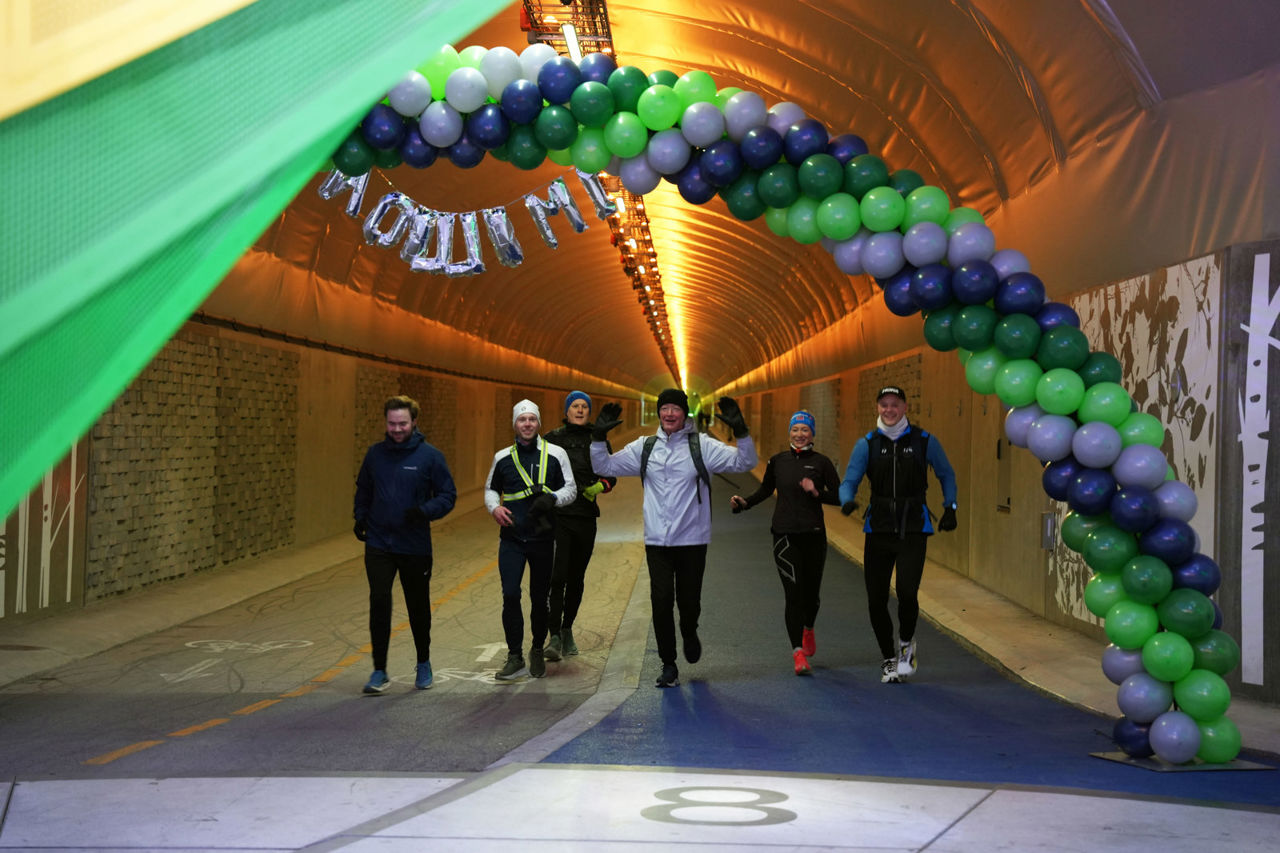 Byråd Eivind Nævdal-Bolstad kom med elsykkel frå Mindemyren. Fylkesordførar Jon Askeland og varaordførar Stian Davies jogga frå Fyllingsdalen. Og så møttest dei i midten for å feire 1 million passerande i Fyllingsdalstunnelen.
