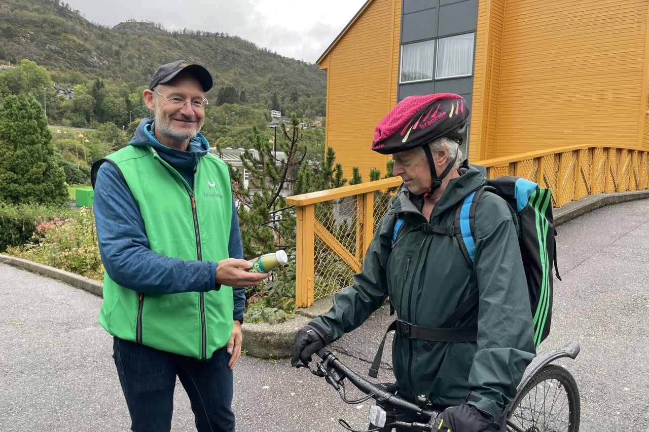 – Her står sykkelen trygt, og inntil 12 timar gratis, seier Einar Grieg og opnar døra til eit av dei ti nye sykkelskåpa.