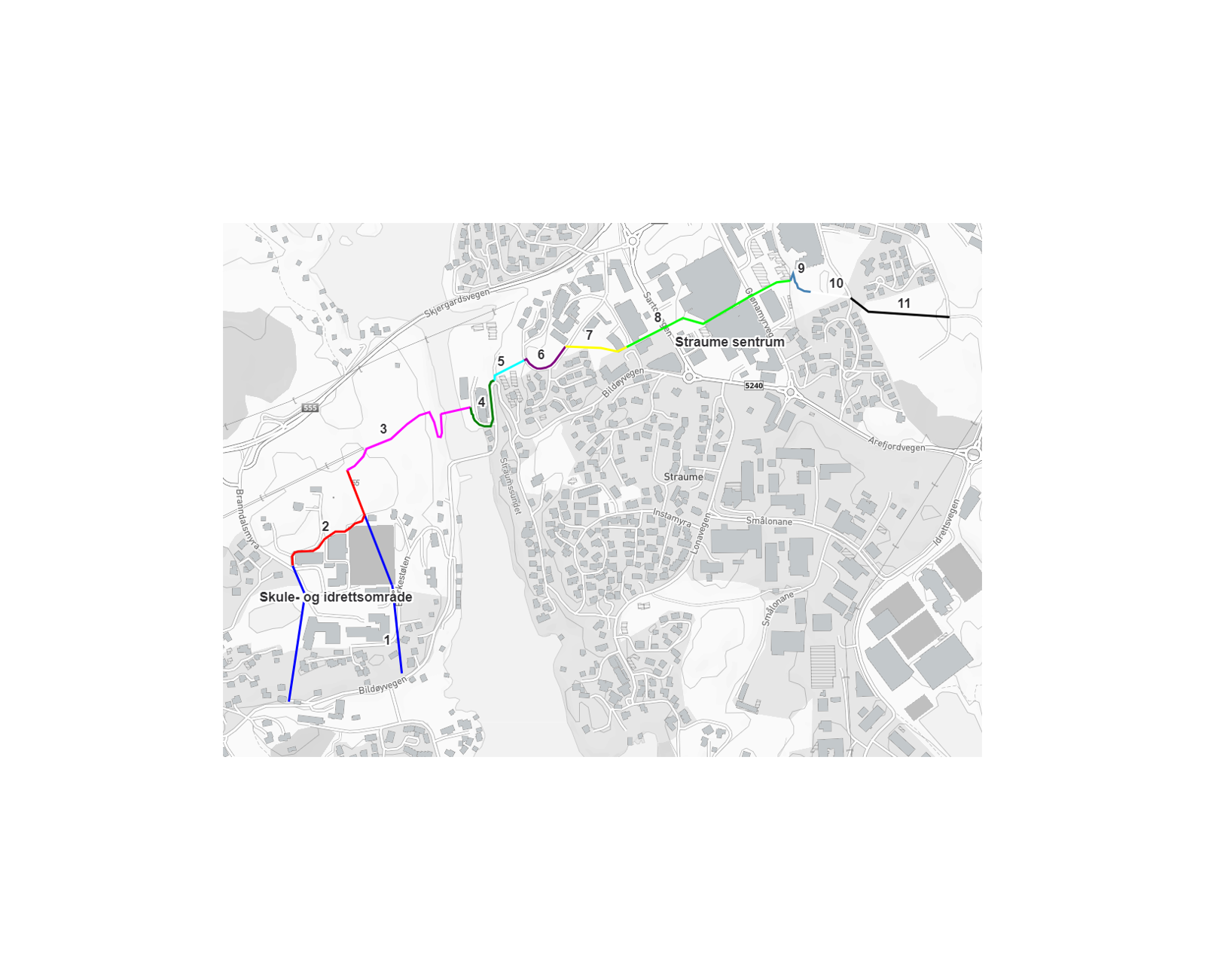 - Trasé/snarveg regulert i plan for Straume senterområde.