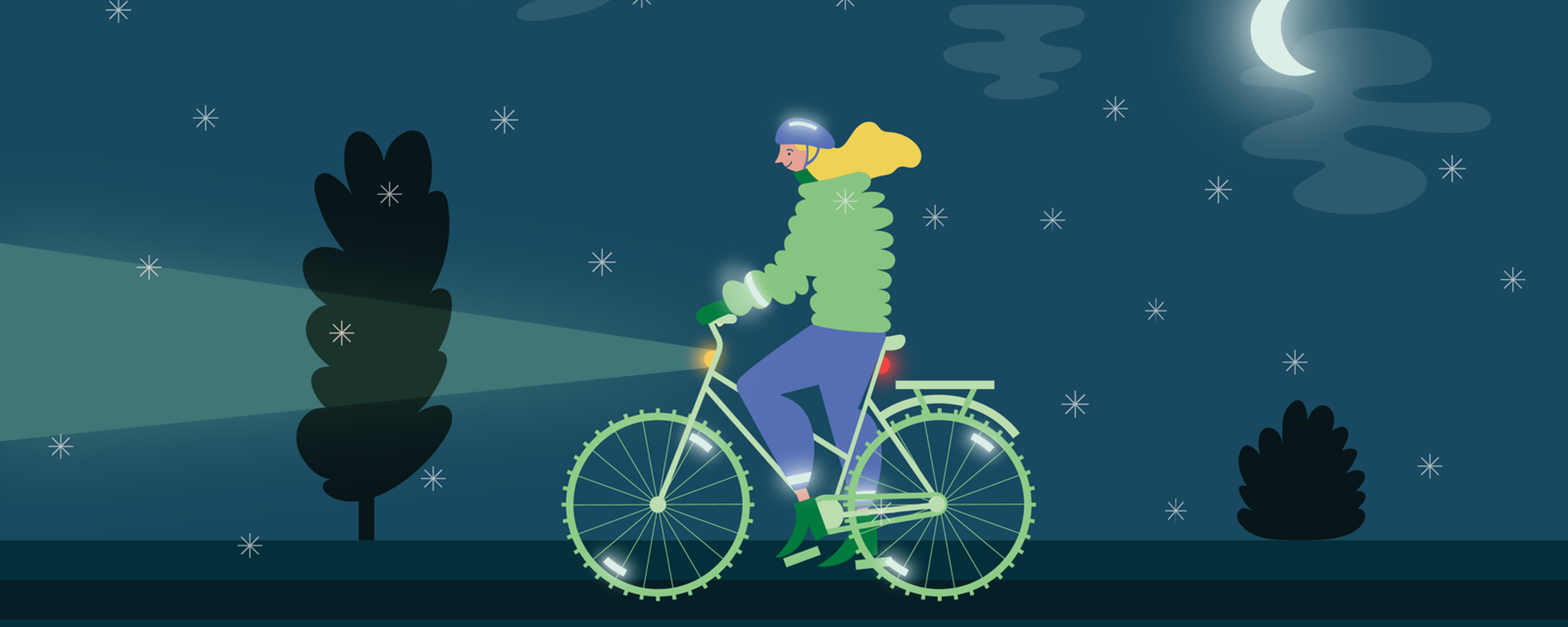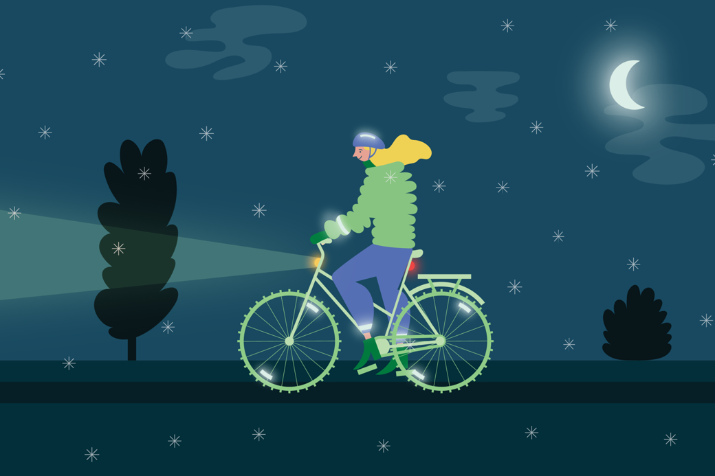 Det er også lurt å ha refleks på kleda i skumring og mørke. Og ikkje minst: Sjekk at du har fungerande sykkelbremser. Godt sykkelvedlikehald er ekstra viktig om vinteren.