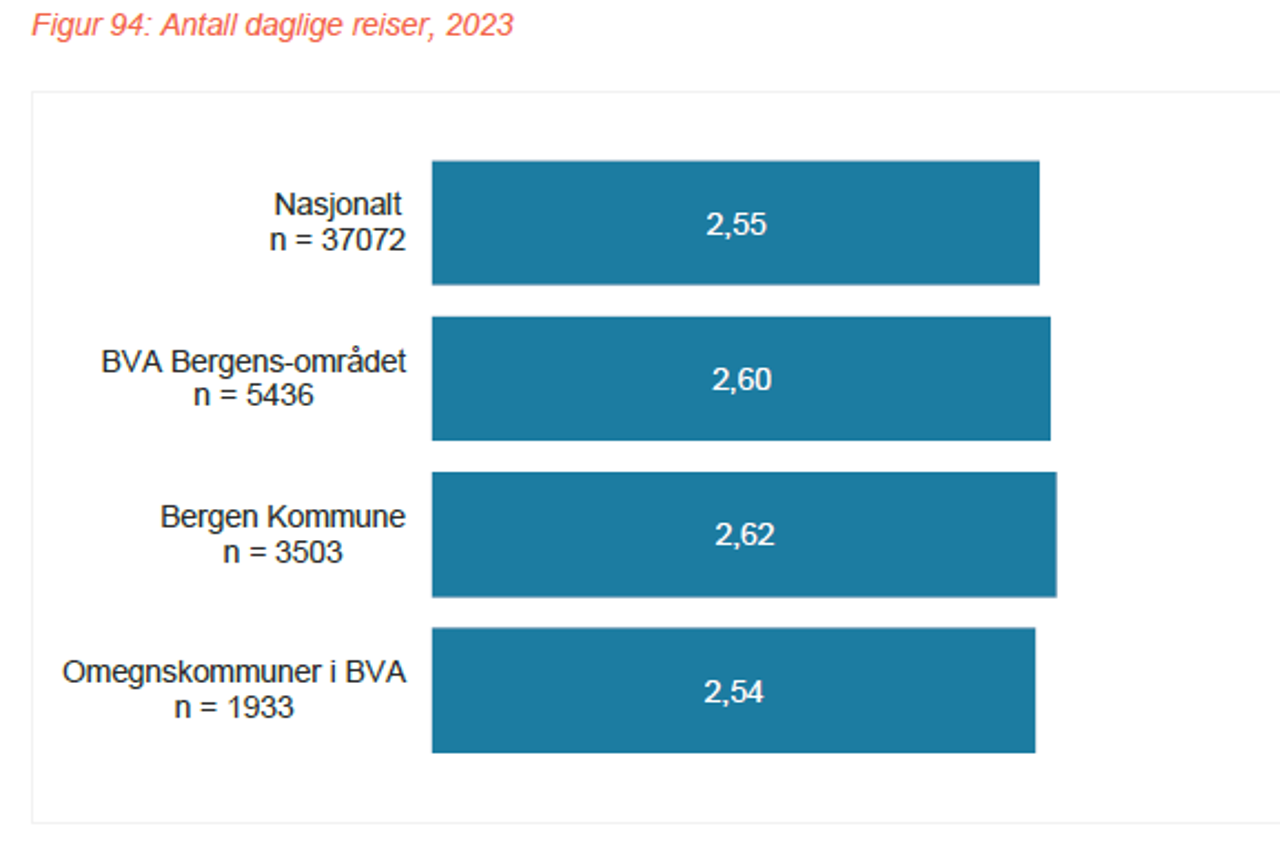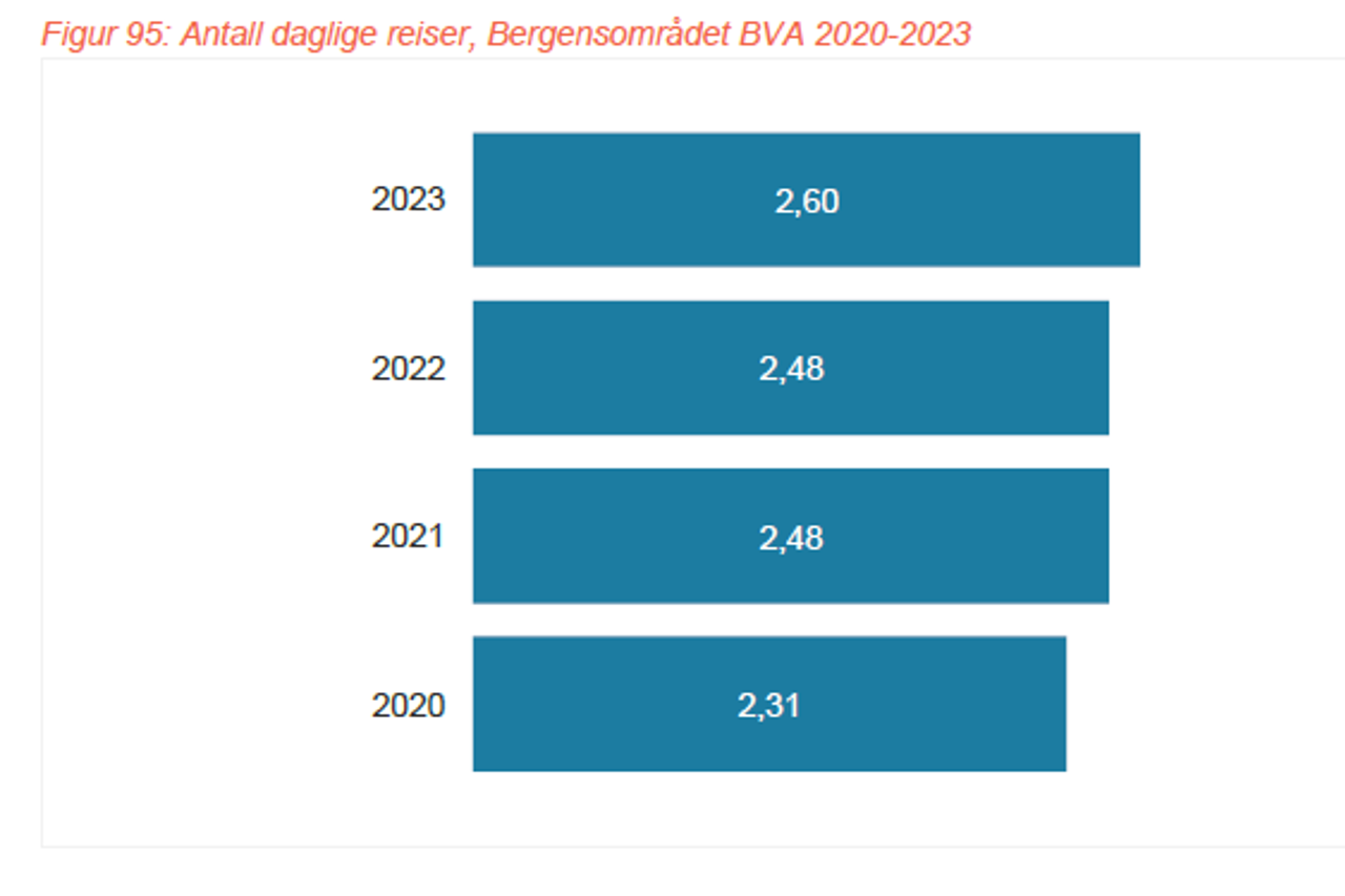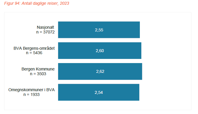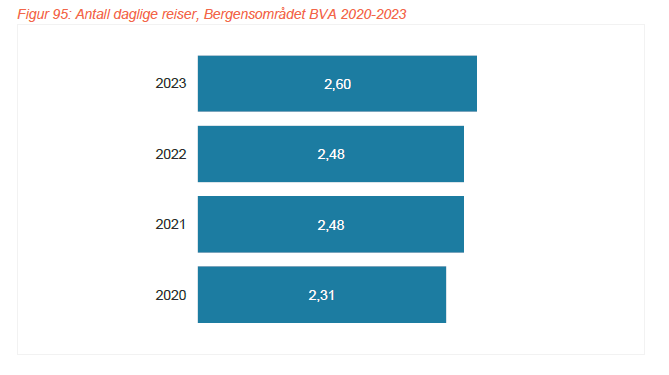 Totalt sett reiser vi meir i bergensområdet. I snitt rapporterer vi at vi gjorde 2,6 reiser for dagen i 2023. Dette er ein auke frå 2,5 i 2022, og opp frå 2,3 i 2020. Auken er i tråd med resten av landet. Når ein ser på tal for Noreg under eitt, var snittalet for daglege reiser også på 2,6, opp frå 2,4 i 2022.