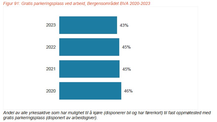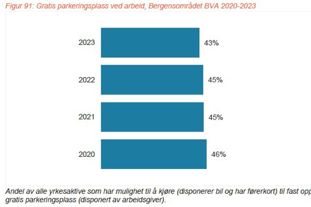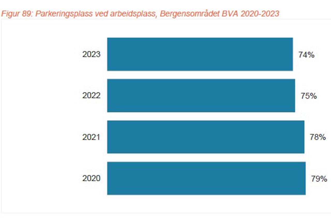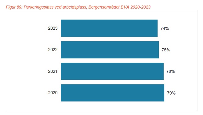Andelen som har tilgang på parkeringsplass ved arbeidsplassen har gått jamt nedover sidan 2020. I 2020 var andelen på 79 prosent, i 2023 på 74 prosent. For Bergen kommune var denne andelen på 69 prosent. Når det gjeld gratis parkering ved arbeidsplass har andelen gått frå 46 prosent i 2020 til 43 prosent i 2020. For Bergen kommune er andelen som har gratis parkering ved arbeidsplass 36 prosent.