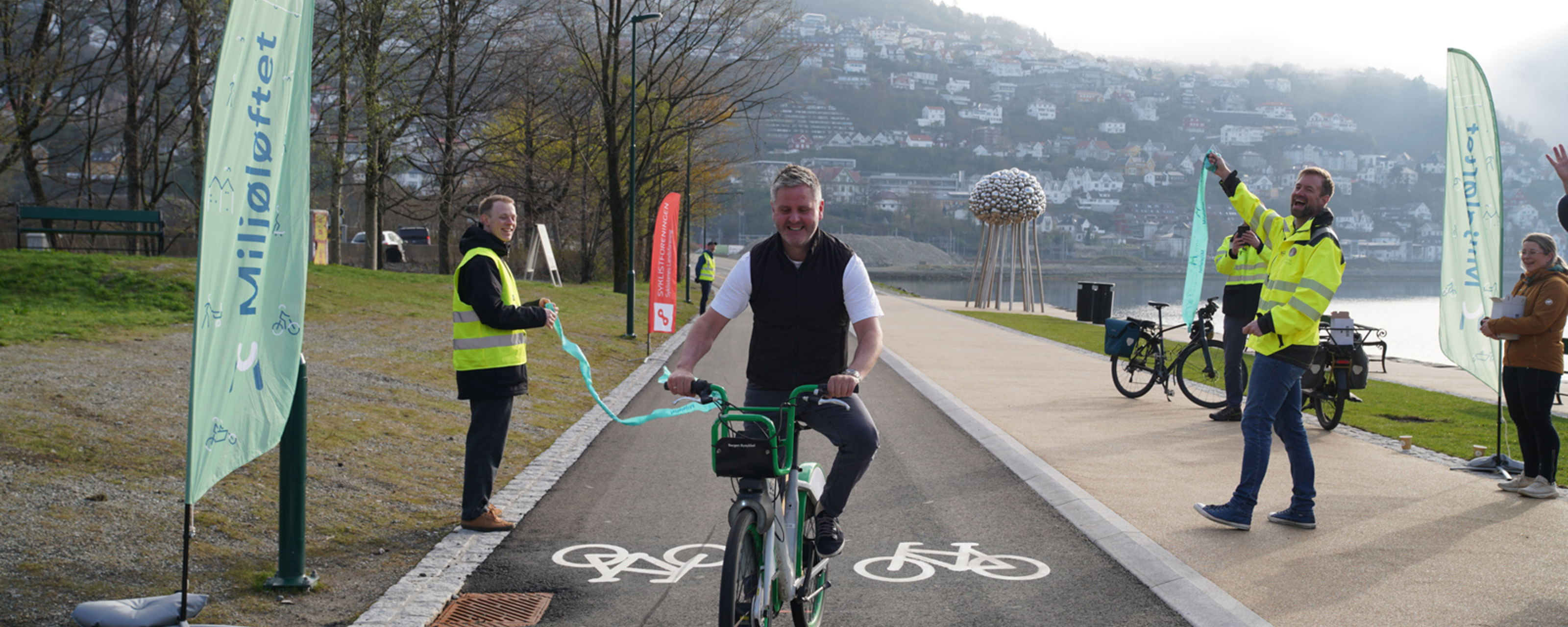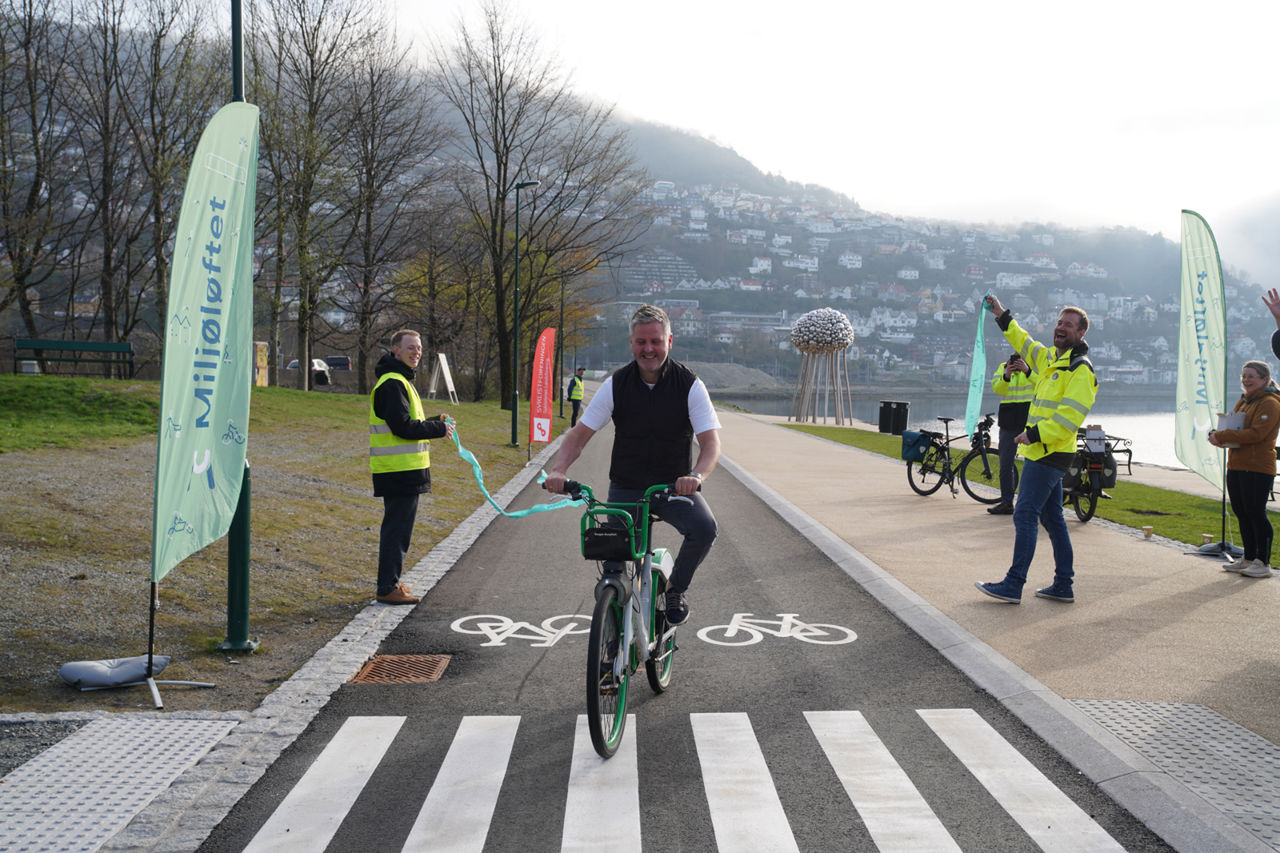 Byutviklingsbyråd Eivind Nævdal-Bolstad fikk æren av å klippe snoren med sykkelen, da nye Nonnestien åpnet 22. april.