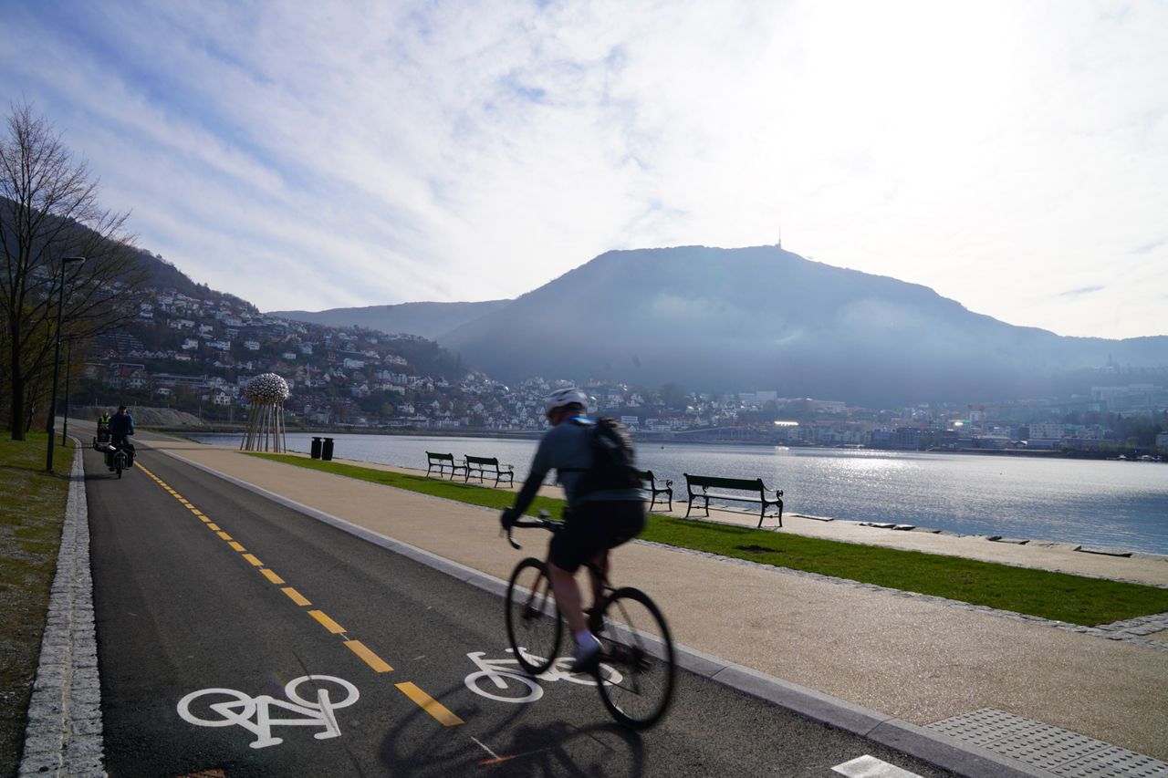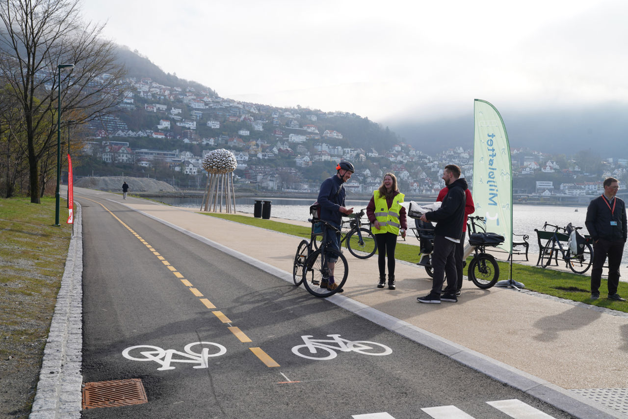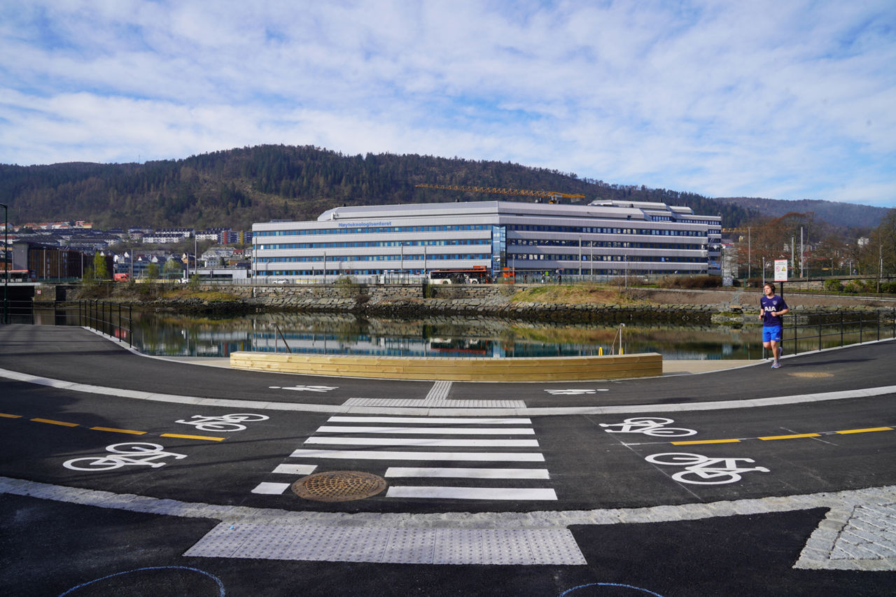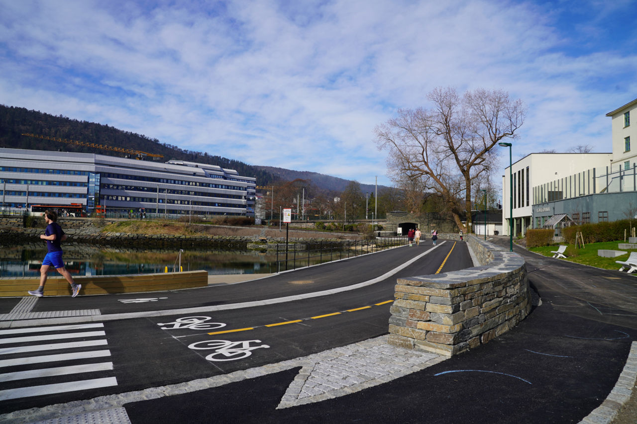 Nå er gang- og sykkelstien oppgradert og asfaltert, og har fått separate felt for å sikre god plass til både de som tar beina og sykkelen fatt. Til sammen er bredden på 6 meter.