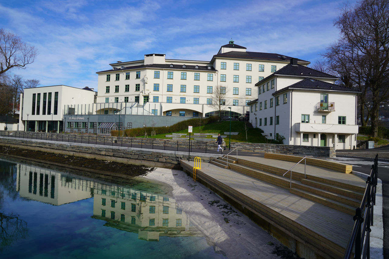 - Foran St. Paul Gymnas er det kommet amfi i tre ned mot vannet.