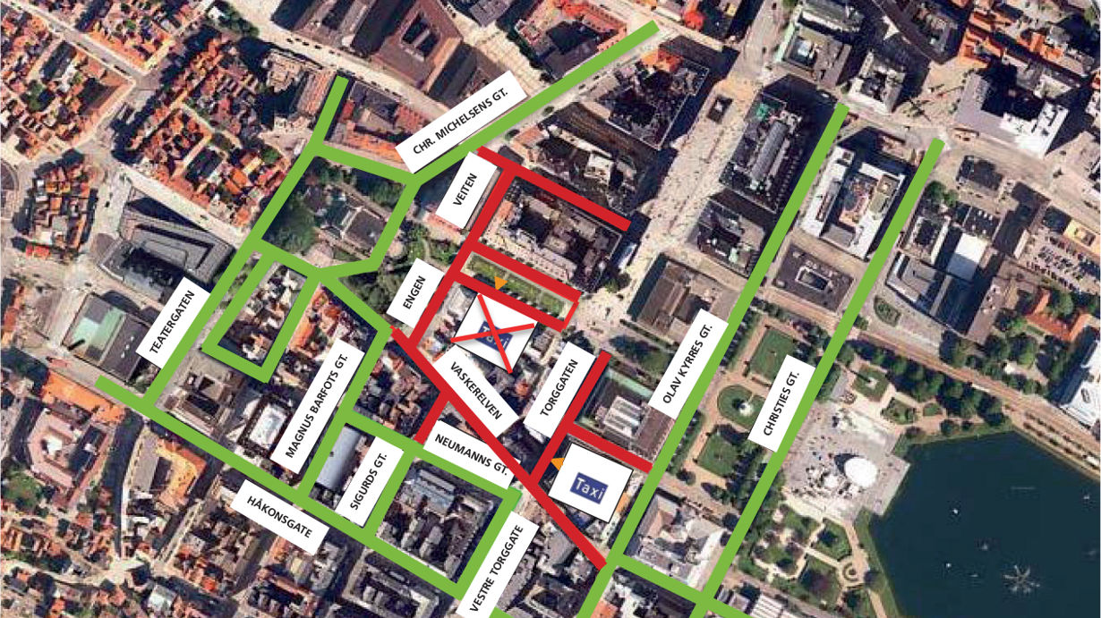 Vaskerelven blir stengt fram til krysset ved Engen/Veiten. Engen og Veiten blir stengt, det samme gjelder Øvre Ole Bulls plass.