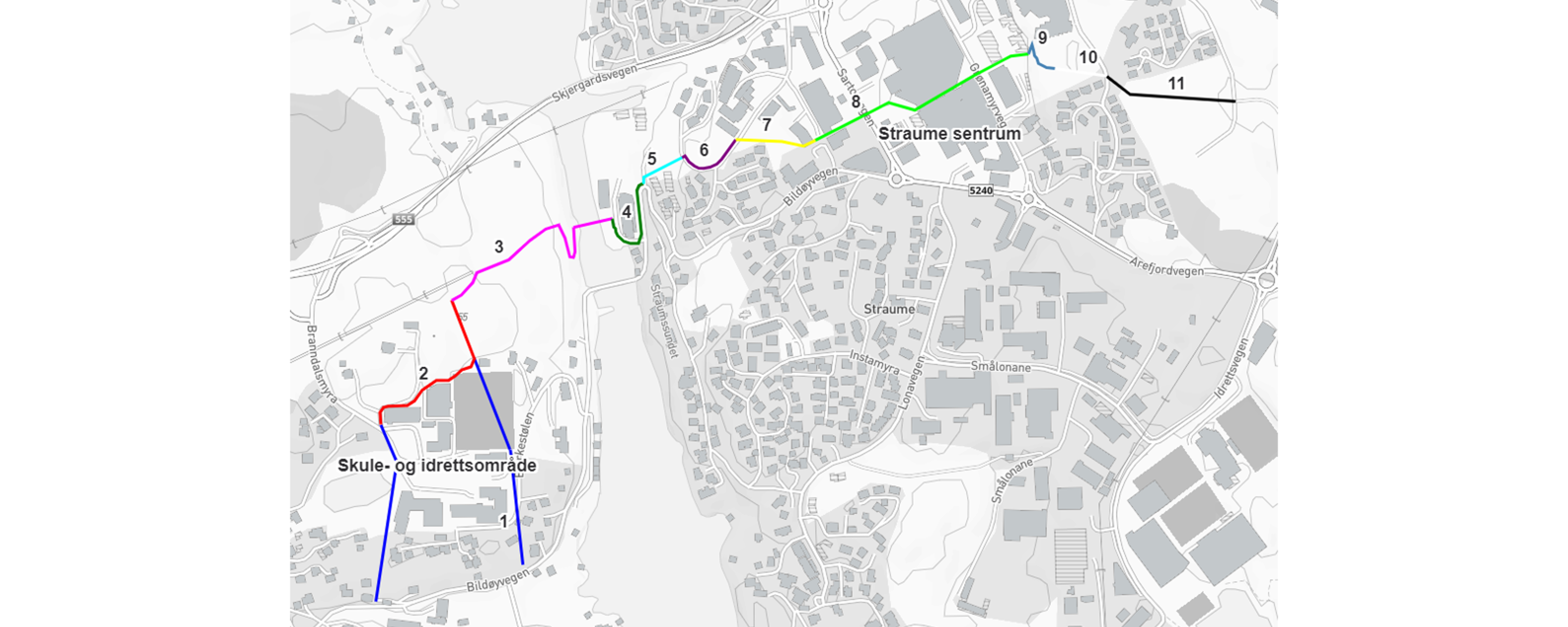 - Trasé/snarveg regulert i plan for Straume senterområde.
